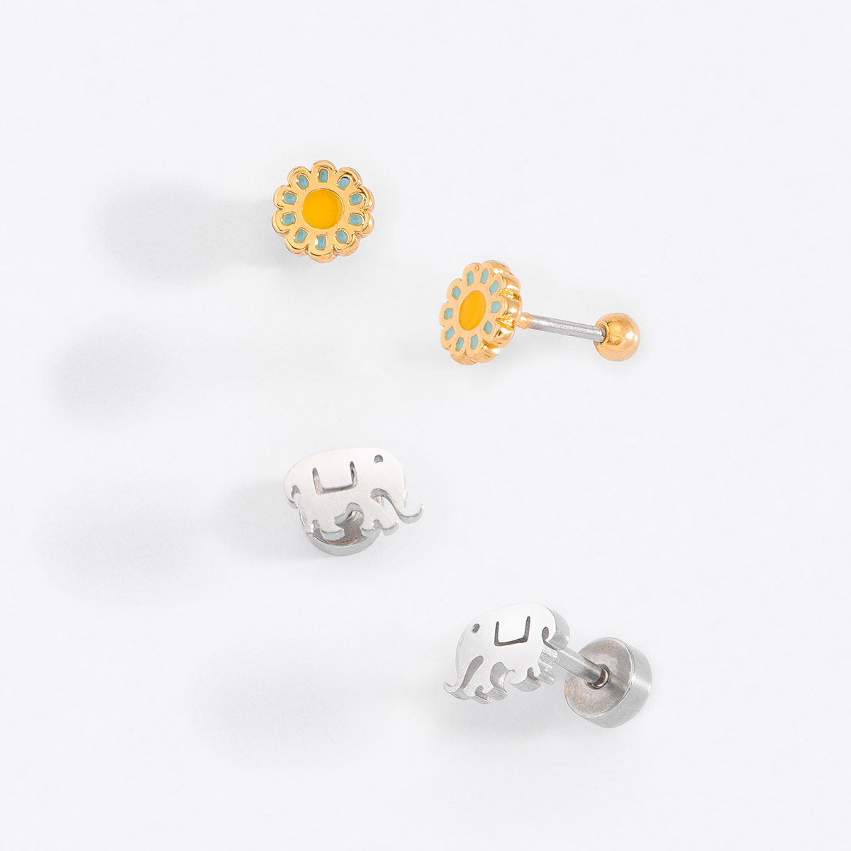 🌸🐘 Dúo de Aretes con Postes: Elefante de Acero Inoxidable y Flores en Baño de Oro con Esmalte en Tono Azul 🌟
